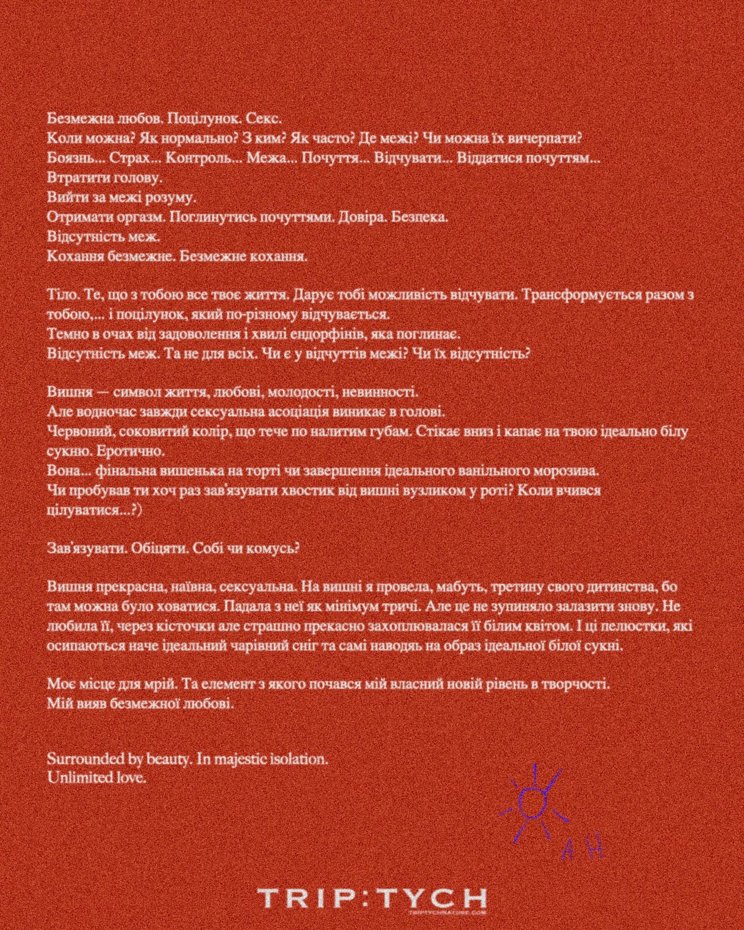 Тіло. Те, що з тобою все твоє життя. Дарує тобі можливість відчувати. Трансформується разом з тобою,… і поцілунок, який по-різному відчувається.
